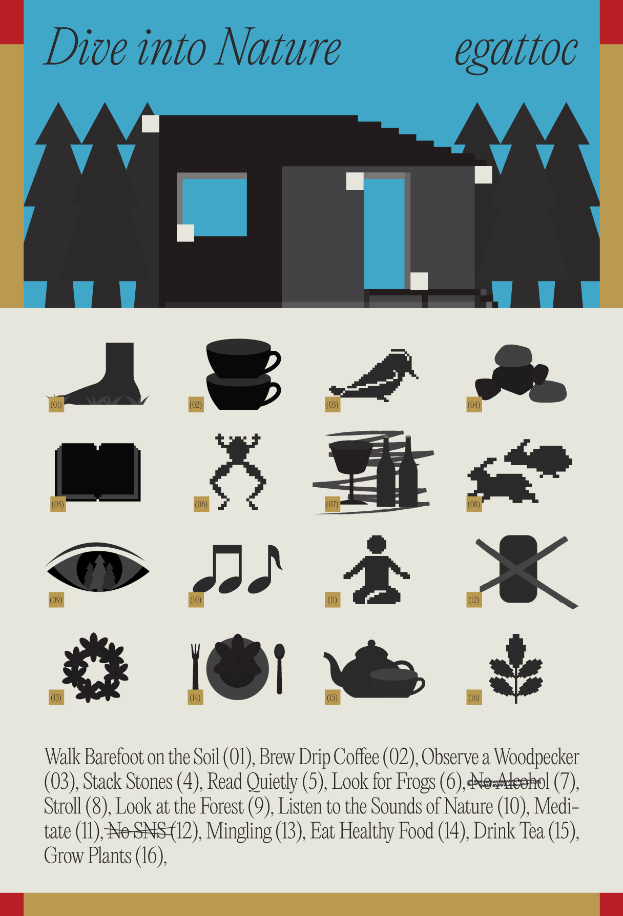 egattoc(에가톳)은 cottage(오두막)를 뒤집은 단어로, 누구나 가슴 속에 하나쯤 품고 있는 숲 속의 작은 오두막을 상징합니다.